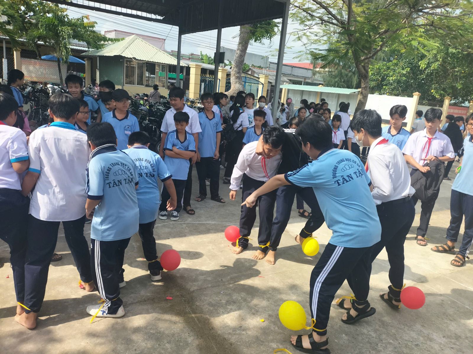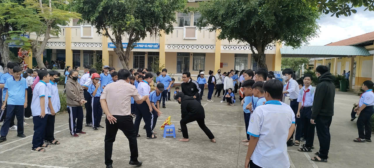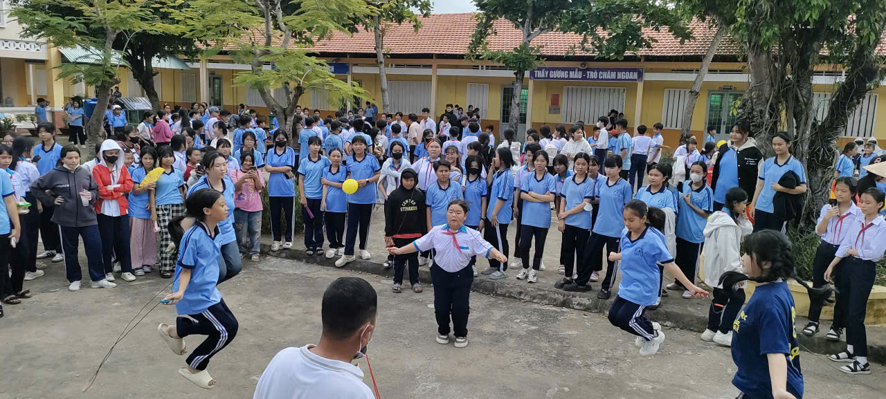 ✨ Phần trò chơi dân gian: Ngay từ đầu buổi, sân trường đã rộn ràng tiếng cười với nhiều trò chơi tập thể hấp dẫn: Đua thuyền trên cạn, Cướp cờ, Nhảy dây tập thể, Đập bong bóng đôi, Đổ nước vào chai. Các trò chơi được chuẩn bị chu đáo, thu hút 100% học sinh tham gia, tạo nên bầu không khí sôi nổi, gắn kết. Mỗi em đều được trải nghiệm niềm vui khi cùng bạn bè thi đua, rèn luyện sự khéo léo, nhanh nhẹn và tinh thần đoàn kết.