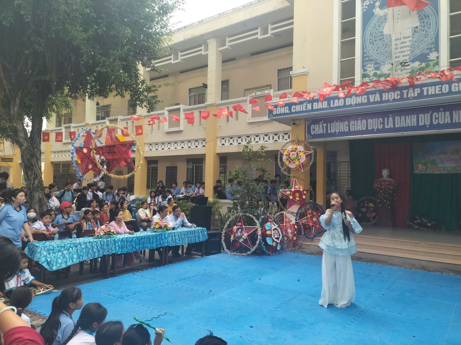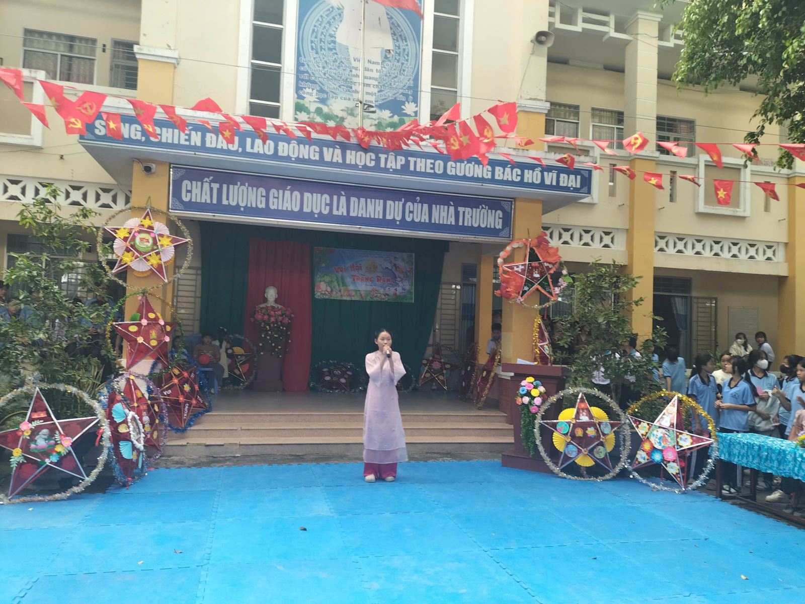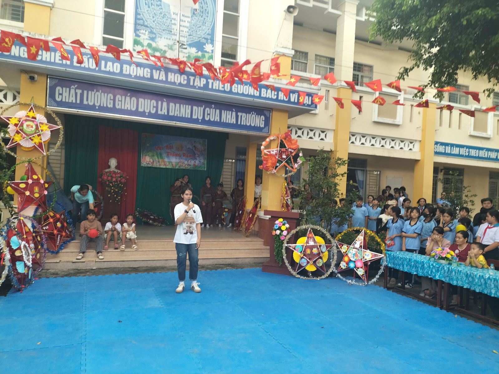 ✨ Phần lễ – Vui hội trăng rằm: Sau phần trò chơi, các em bước vào chương trình chính với nhiều hoạt động mang đậm màu sắc Trung thu. Những tiết mục văn nghệ “Vui hội trăng rằm” do học sinh biểu diễn đã mở màn cho buổi lễ đầy hứng khởi. Các em được cùng nhau ôn lại truyền thống của ngày Tết Trung thu, nghe thầy cô gửi gắm những lời chúc yêu thương, cùng tham gia rước đèn, phá cỗ và nhận những phần quà đầy ý nghĩa từ GVCN và nhà trường.